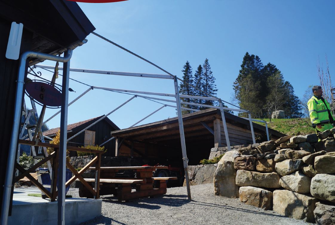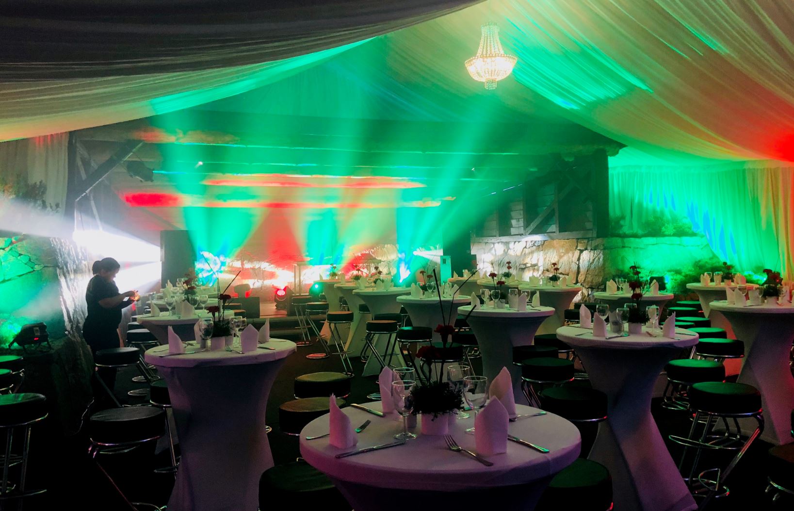 En av våre kunder ville feire firmaets jubileum midt i naturen. Mellom en "løe" og et vedskjul satte vi opp telt på spesialmål som vi deretter innredet. I vedskjulet ble det scene med fantastisk underholdning, på gårdsplassen ble det dekket opp til galla og inne i løa ble det afterparty etter desserten.